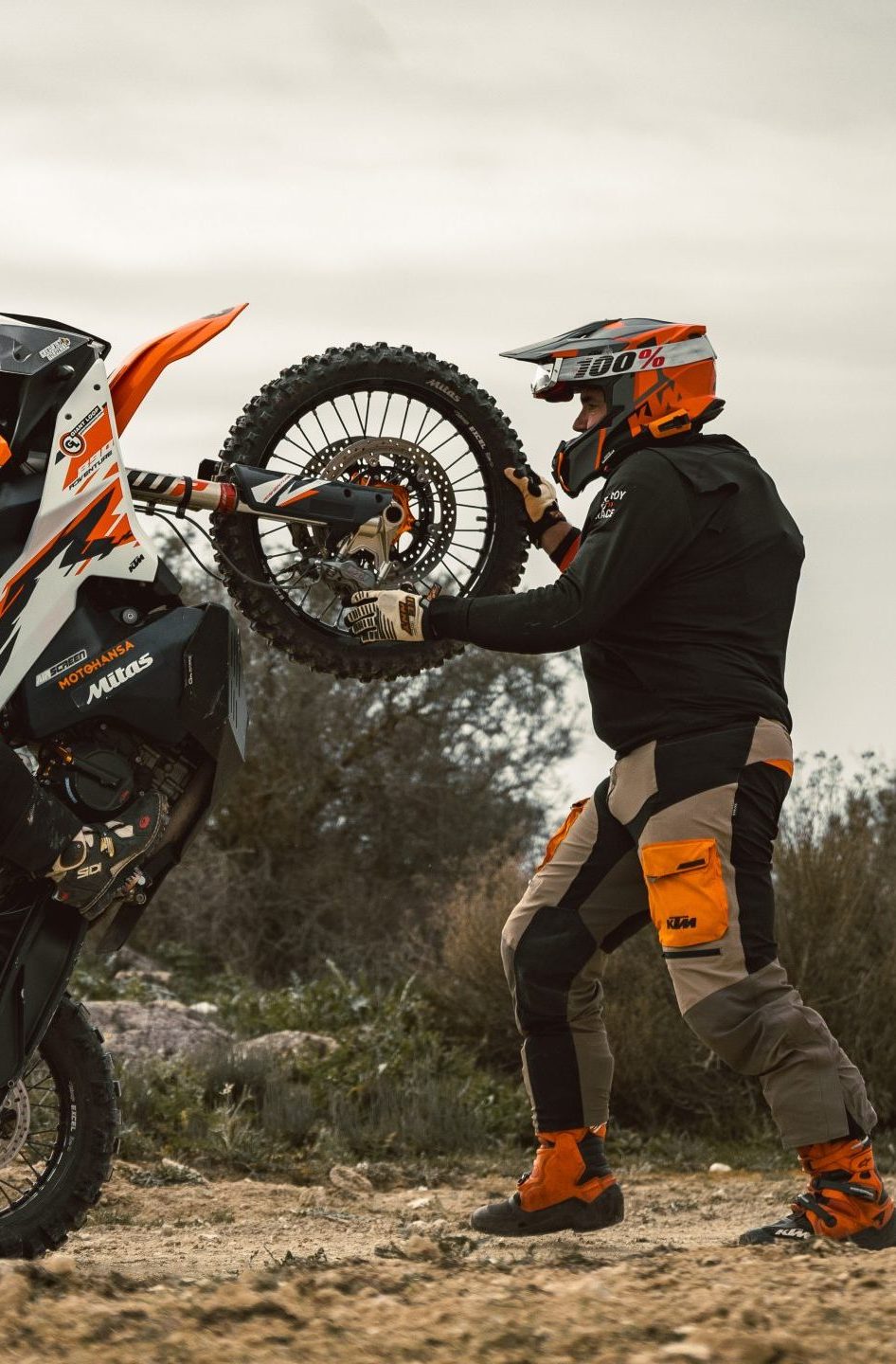 Les pneus tout-terrain minimum 50% off-road, Types TKC80, ANAKEE WILD ou Mitas E07+ sont obligatoires pour vivre cette aventure. Des protections type sabot moteur et « crash-bars » sont conseillés. Un set d’outils propres à la moto, des chambres à air (ou kit réparation tubeless) sont indispensables.